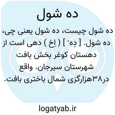ده شول. [ دِه ْ ] ( اِخ ) دهی است از دهستان کوغر بخش بافت شهرستان سیرجان. واقع در38هزارگزی شمال باختری بافت. سکنه آن 155 تن. ساکنین از طایفه افشار هستند. ( از فرهنگ جغرافیایی ایران ج 8 ).