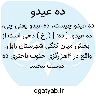 ده عیدو. [ دِه ْ ] ( اِخ ) دهی است از بخش میان کنگی شهرستان زابل. واقع در 4هزارگزی جنوب باختری ده دوست محمد کنار راه مالرو ده دوست محمد به زابل. سکنه آن 150 تن. آب آن از رودخانه هیرمند تأمین می شود. ( از فرهنگ جغرافیایی ایران ج 8 ).