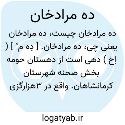 ده مرادخان. [ دِه ْم ُ ] ( اِخ ) دهی است از دهستان حومه بخش صحنه شهرستان کرمانشاهان. واقع در 3هزارگزی جنوب خاوری صحنه. سکنه آن 272 تن. آب آن از چشمه و سراب بیدسرخ. راه فرعی به شوسه دارد. ( از فرهنگ جغرافیایی ایران ج 5 ).