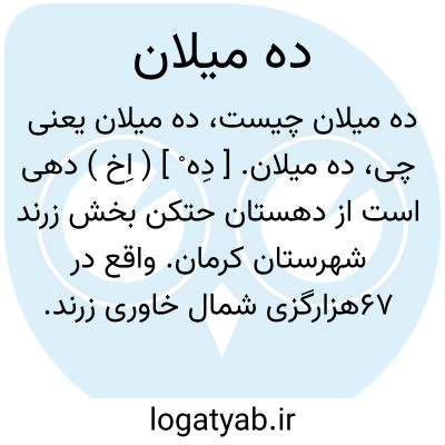 ده میلان. [ دِه ْ ] ( اِخ ) دهی است از دهستان حتکن بخش زرند شهرستان کرمان. واقع در 67هزارگزی شمال خاوری زرند. سکنه آن 105 تن. آب آن از چشمه تأمین می شود. ( از فرهنگ جغرافیایی ایران ج 8 ).