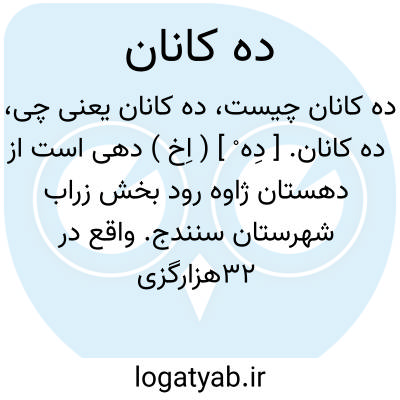 ده کانان. [ دِه ْ ] ( اِخ ) دهی است از دهستان ژاوه رود بخش زراب شهرستان سنندج. واقع در 32هزارگزی جنوب خاوری زراب. سکنه آن 85 تن. آب آن از چشمه تأمین می شود. ( از فرهنگ جغرافیایی ایران ج 5 ).