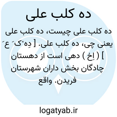 ده کلب علی. [ دِه ْک َ ع َ ] ( اِخ ) دهی است از دهستان چادگان بخش داران شهرستان فریدن. واقع در 34هزارگزی جنوب خاور داران. دارای 298 تن سکنه می باشد. آب آن از چشمه تأمین می شود. راه آن فرعی. ( از فرهنگ جغرافیایی ایران ج 10 ).