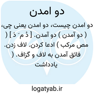 ( دو آمدن ) دو آمدن. [ دُ م َ دَ ] ( مص مرکب ) ادعا کردن. لاف زدن. فائق آمدن به لاف و گزاف. ( یادداشت مؤلف ).