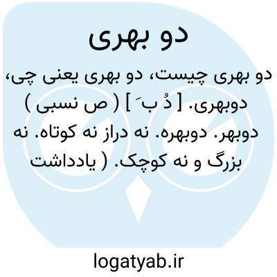 دوبهری. [ دُ ب َ ] ( ص نسبی ) دوبهر. دوبهره. نه دراز نه کوتاه. نه بزرگ و نه کوچک. ( یادداشت مؤلف ). مربوع. ( ابوالفتوح رازی ). رجوع به دوبهر و دوبهره شود.
