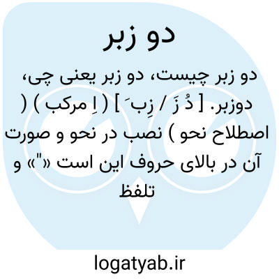 دوزبر. [ دُ زَ / زِب َ ] ( اِ مرکب ) ( اصطلاح نحو ) نصب در نحو و صورت آن در بالای حروف این است «"» و تلفظ آن [ اَن ْ ] مانند: کتاباً، حساباً، زیداً، صبراً. ( یادداشت مؤلف ). || تنوین نصب ایرانی است و معنی مخصوص دارد وبیشتر افاده حال کند؛ یعنی قید حالت سازد مانند متنکراً، غفلتاً، احتراماً، استرحاماً، توقیراً، مکرماً، عالماً و عامداً، و غالباً به جای آن می شود یکی از کلمات ( از روی، از راه ) یا یکی از حروف اضافه فارسی را به اول کلمه افزود: تعصباً؛ از راه تعصب. احتراماً؛ با احترام. حقیقتاً مرد خوبی است؛ در حقیقت... سریعاً آمد؛ بسرعت آمد. فوراً فهمید؛ برفور فهمید.غیاباً ارادت دارم؛ درغیاب ارادت دارم. صریحاً به او گفتم؛ به صراحت به او گفتم. توقیراً؛ از روی توقیر. تخمیناً دو کیلو وزن دارد؛ به تخمین... تحقیقاً نمی دانم؛ به تحقیق نمی دانم. شدیداً به او حمله کرد؛ به شدت حمله کرد. حقاً؛ از روی حق. ( یادداشت مؤلف ).