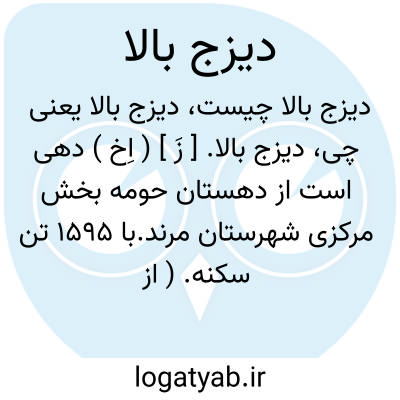 دیزج بالا. [ زَ ] ( اِخ ) دهی است از دهستان حومه بخش مرکزی شهرستان مرند.با 1595 تن سکنه. ( از فرهنگ جغرافیائی ایران ج 4 ).