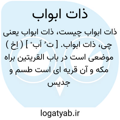 ذات ابواب. [ ت ُ اَب ْ ] ( اِخ ) موضعی است در باب القریتین براه مکه و آن قریه ای است طسم و جدیس را. یاقوت ازاصمعی و او از ابوعمروبن العلاء روایت کند که گفت، در ذات ابواب درمهائی یافت شد هر یک بوزن شش درهم و دو دانگ از دراهم ما. و من به یابندگان آن دراهم گفتم آنها را بمن دهید و بوزن آن درهم ستانید. گفتند ما بیم داریم چه ما باید این یافته ها را بسلطان دهیم.