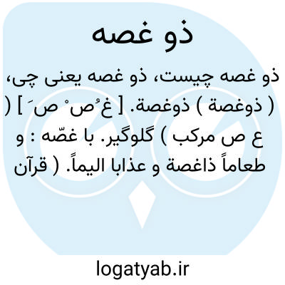 ( ذوغصة ) ذوغصة. [ غ ُص ْ ص َ ] ( ع ص مرکب ) گلوگیر. با غصّه: و طعاماً ذاغصة و عذابا الیماً. ( قرآن 73 13/ ) و طعامی گلوگیر و شکنجه دردناک. ( تفسیر ابوالفتوح ج 5 ص 415 ). و در تفسیر آن گوید: و طعامی با غصه که در گلوها بماند فرو نشود و بالا نیاید یقال غص باللقمة و شرق بالماء و شجی بالعظم اذا بقی فی الحلق. وطعام اهل دوزخ غسلین و زقوم باشد. ( ایضاً ص 419 ).