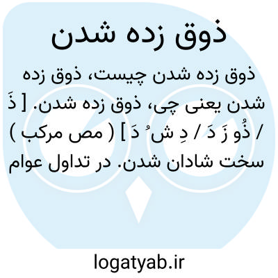 ذوق زده شدن. [ ذَ / ذُو زَ دَ / دِ ش ُ دَ ] ( مص مرکب ) سخت شادان شدن. در تداول عوام، از دست بشدن انتظام عملی و فکری در مقابل حصول آرزوئی دیر دست رس. || از شادمانی بسیار و ناگهانی بیمار شدن یا مردن.