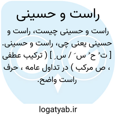 راست و حسینی. [ ت ُ ح ُ س َ / س ِ ] ( ترکیب عطفی، ص مرکب ) در تداول عامه، حرف راست واضح. ( فرهنگ نظام ). || ( اِ مرکب ) نام دو مقام موسیقی است. ( فرهنگ نظام ).