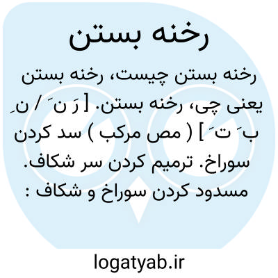 رخنه بستن. [ رَ ن َ / ن ِ ب َ ت َ ] ( مص مرکب ) سد کردن سوراخ. ترمیم کردن سر شکاف. مسدود کردن سوراخ و شکاف: