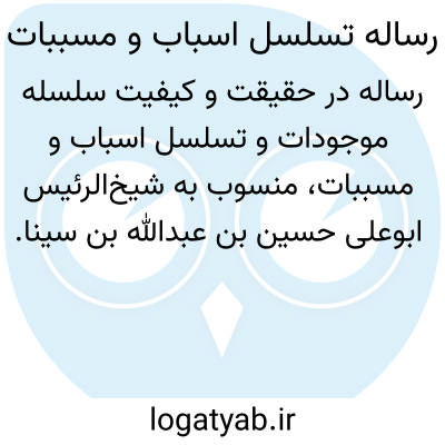 [ویکی فقه] رساله تسلسل اسباب و مسببات (کتاب). «رساله در حقیقت و کیفیت سلسله موجودات و تسلسل اسباب و مسببات» نام رساله ای است که مرحوم شیخ الرئیس ابو علی حسین بن عبدالله بن سینا، در موضوع خلقت موجودات، به زبان فارسی و برای ارائه نظریه اسلام در این زمینه که متفاوت با نظریات دانشمندان یونانی و دیگر اندیشمندان غیر مسلمان است، در قرن چهارم هجری، به رشته تحریر درآورده است.