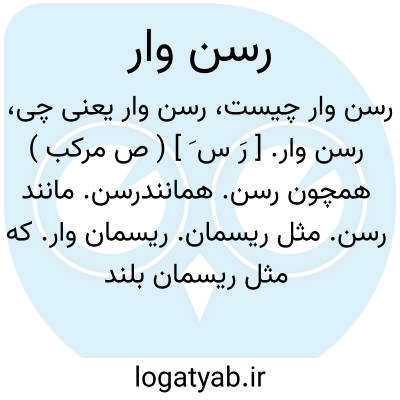 رسن وار. [ رَ س َ ] ( ص مرکب ) همچون رسن. همانندرسن. مانند رسن. مثل ریسمان. ریسمان وار. که مثل ریسمان بلند باشد. که مانند رسن دراز باشد: