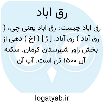 رق آباد. [ رُ ] ( اِخ ) دهی از دهستان حتکن بخش زرند شهرستان کرمان. سکنه آن 348 تن است. آب آن از چشمه. محصول عمده آنجا غلات و حبوب. صنایع دستی زنان آنجا قالیبافی با نقشه است. ( از فرهنگ جغرافیایی ایران ج 8 ).