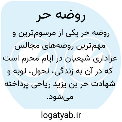 [ویکی شیعه] روضه حُرّ، از روضه های مجالس عزاداری شیعیان در دهه اول محرم. در این روضه از شخصیت حر بن یزید ریاحی، رویارویی او با امام حسین(ع)، توبه و سپس شهادت وی سخن گفته می شود و معمولاً علاوه بر عزاداری، حاضران به الگو گرفتن از حر در بازگشت به سوی خدا و توبه دعوت می شوند.