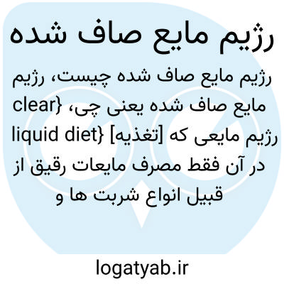 {clear liquid diet} [تغذیه] رژیم مایعی که در آن فقط مصرف مایعات رقیق از قبیل انواع شربت ها و چای و قهوه و آبِ گوشت و آب میوۀ صاف شده مجاز است