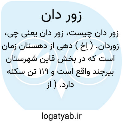 زوردان. ( اِخ ) دهی از دهستان زمان است که در بخش قاین شهرستان بیرجند واقع است و 119 تن سکنه دارد. ( از فرهنگ جغرافیایی ایران ج 9 ).