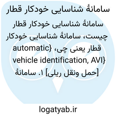 {automatic vehicle identification, AVI} [حمل ونقل ریلی] 1. سامانۀ فرستندۀ اطلاعات برای تعیین شمارۀ قطار و اطلاعات مفید دیگر دربارۀ واگن های قطار با استفاده از واحدهای کنار خط 2. سازوکاری نیمه خودکار برای دادن گزارش درمورد حرکت قطار براساس موقعیت خط نوردهای باری