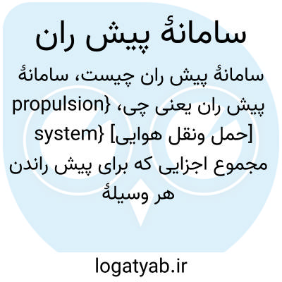 {propulsion system} [حمل ونقل هوایی] مجموع اجزایی که برای پیش راندن هر وسیلۀ پرنده لازم است، شامل موتور و متعلقات آن، سامانۀ واپایش موتور، سامانۀ سوخت، سامانه های تجهیزات، ورودی های هوا و سامانۀ خنک سازی