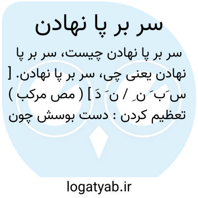 سر بر پا نهادن. [ س َب َ ن ِ / ن َ دَ ] ( مص مرکب ) تعظیم کردن: دست بوسش چون رسید از پادشاه گر گزیند بوس پا باشد گناه گرچه سر بر پانهادن خدمت است پیش آن خدمت خطا و زلت است.مولوی ( مثنوی چ خاور ص 37 ).