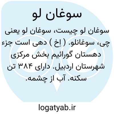 سوغان لو (نیر). سوغان لو یک روستا در ایران است که در دهستان یورتچی غربی واقع شده است. سوغانلو ۱۸۳ نفر جمعیت دارد.