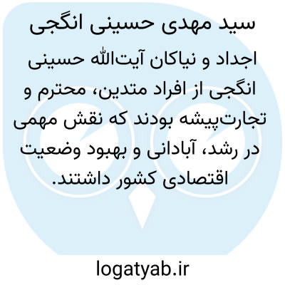 [ویکی اهل البیت] اجداد و نیاکان آیت الله حسینی انگجی افرادی متدین، محترم و تجارت پیشه بودند و پیشینه ای ممتاز در ترقی، آبادانی و بهبودی وضع اقتصادی کشور داشتند. سراهای حاج سید حسین، حاج میرابوالحسن و حاج میرزا محمد و تیمچه و بازار حاج میرابوالحسن، از یادگارهای خاندان انگجی در شهر تبریز می باشد.