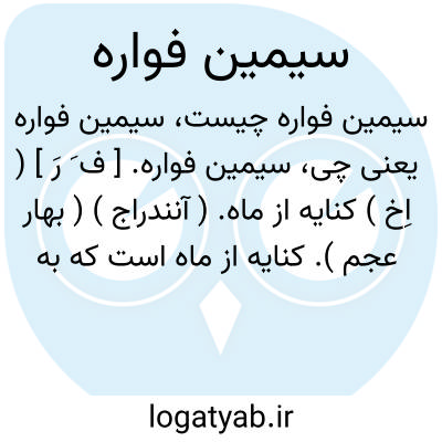 سیمین فواره. [ ف َ رَ ] ( اِخ ) کنایه از ماه. ( آنندراج ) ( بهار عجم ). کنایه از ماه است که به عربی قمر گویند و بجای فا، قاف و نون هم بنظر آمده. ( برهان ).