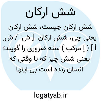 شش ارکان. [ ش َ / ش ِ اَ ] ( اِ مرکب ) سته ضروری را گویند؛ یعنی شش چیز که تا وقتی که انسان زنده است بی اینها نباشد: اول، هوا که محیط ابدان است. دوم، اکل و شرب. سوم، حرکت و سکون بدنیه. چهارم، حرکت و سکون نفسانیه مثل غضب و فرح و خوف و حزن و خجالت. پنجم، نوم و یقظه؛ یعنی خواب و بیداری. ششم، استفراغ و احتباس، مثلاً خروج بول و غائط و جماع و فصد و حمام، و احتباس، عدم خروج چیزهای مذکور است از بدن. ( از غیاث اللغات ).