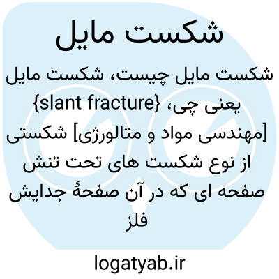{slant fracture} [مهندسی مواد و متالورژی] شکستی از نوع شکست های تحت تنش صفحه ای که در آن صفحۀ جدایش فلز نسبت به محورِ اِعمالِ تنش مایل است