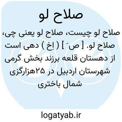 صلاح لو. [ ص َ ] ( اِخ ) دهی است از دهستان قلعه برزند بخش گرمی شهرستان اردبیل در 25هزارگزی شمال باختری گرمی و 15هزارگزی شوسه اردبیل به گرمی. جلگه. گرمسیر. سکنه 51 تن. آب آن از چشمه. محصول آنجا غلات، حبوبات. شغل اهالی زراعت است. راه مالرو دارد. ( فرهنگ جغرافیائی ایران ج 4 ).