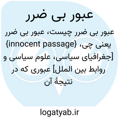 {innocent passage} [جغرافیای سیاسی، علوم سیاسی و روابط بین الملل] عبوری که در نتیجۀ آن ضرر و زیان و تهدیدی متوجه امنیت و منافع ملی کشور ساحلی نشود