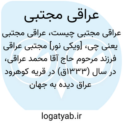 [ویکی نور] مجتبی عراقی فرزند مرحوم حاج آقا محمد عراقی، در سال (1333ق) در قریه کوهرود عراق دیده به جهان گشود.