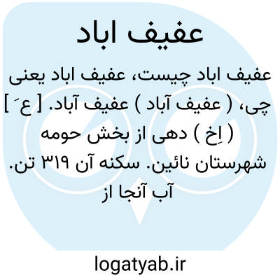 ( عفیف آباد ) عفیف آباد. [ ع َ ] ( اِخ ) دهی از بخش حومه شهرستان نائین. سکنه آن 319 تن. آب آنجا از قنات و محصولات آن غلات است. ( از فرهنگ جغرافیایی ایران ج 10 ).