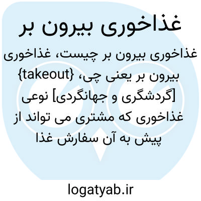 {takeout} [گردشگری و جهانگردی] نوعی غذاخوری که مشتری می تواند از پیش به آن سفارش غذا بدهد و به بیرون ببرد متـ. رستوران بیرون بَر
