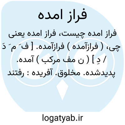 ( فراز آمده ) ( صفت ) ۱ - نزدیک آمده پیش آمده ۲ - رسیده ۳ - وارد شده ۴ - بالا آمده ۵ - به هم آمده بسته شده ۶ - پدید شده مخلوق آفریده.