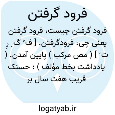 فرودگرفتن. [ ف ُ گ ِ رِ ت َ ] ( مص مرکب ) پایین آمدن. ( یادداشت بخط مؤلف ): حسنک قریب هفت سال بر دار بماند تا به دستور وی فرودگرفتند و دفن کردند. ( تاریخ بیهقی ). || دستگیر کردن. بند نهادن. مقید کردن: فردا چون غازی به درگاه آمد او را فرود خواهند گرفت. ( تاریخ بیهقی ). پیش از آنکه او را فرودگرفتندی خلیتاشان مسرع رفته بودندی با نامها. ( تاریخ بیهقی ). رجوع به فروگرفتن شود.