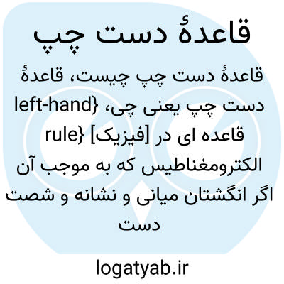 {left-hand rule} [فیزیک] قاعده ای در الکترومغناطیس که به موجب آن اگر انگشتان میانی و نشانه و شصت دست چپ در وضعیت متعامد باشند، به ترتیب جهت جریان الکتریکی و میدان مغناطیسی و نیروی وارد به سیم حامل جریان را نشان می دهند