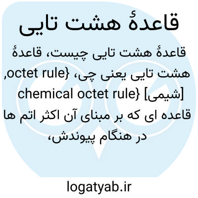 {octet rule, chemical octet rule} [شیمی] قاعده ای که بر مبنای آن اکثر اتم ها در هنگام پیوندش، غالباً الکترون هایی را از دست می دهند یا می گیرند یا به اشتراک میگذارند تا لایۀ بیرونی آنها هشت الکترونی و پایدار شوند