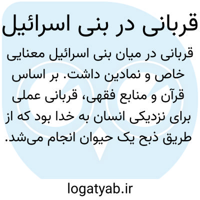 [ویکی فقه] قربانی در بنی اسرائیل (قرآن). قربانی به معنی نزدیکی انسان به خدا از طریق اقدام به ذبح یک حیوان می باشد.