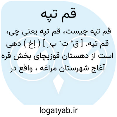 قم تپه. [ ق ُ ت َ پ ِ ] ( اِخ ) دهی است از دهستان قوزیچای بخش قره آغاج شهرستان مراغه، واقع در 34500گزی شمال باختری قره آغاج و 4500گزی خاور شوسه مراغه به میاندوآب. موقع آن کوهستانی و هوای آن معتدل مالاریایی است. سکنه آن 390تن است. آب آن از چشمه و محصول آن غلات، نخود، بزرک و شغل اهالی زراعت و صنایع دستی زنان جاجیم بافی است.راه مالرو دارد. ( از فرهنگ جغرافیایی ایران ج 4 ).