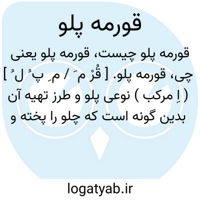 قورمه پلو. [ قُرْ م َ / م ِ پ ُ ل ُ ] ( اِ مرکب ) نوعی پلو و طرز تهیه آن بدین گونه است که چلو را پخته و ادویه زده، روغن بر رویش نمیدهند و همان قدر که باید به رویش داد در قورمه می ریزند و آب قورمه را به رویش می ریزند. طریق قورمه این است: بقدری که باید روغن در پلو ریزند در دیگ سنگی می ریزند و پیاز هم میریزند تا سرخ شود، بعد از سرخ شدن پیاز گوشت قورمه را داخل کنند و بقدری که با آن بجوشد آب می کنند. وقتی که بخوردش رفت و بروغن آمد پلو را کشیده گوشت یخنی را لای آن میگذارند و روغن همان قورمه را عوض روغن در توی دوری میریزند اگر بخواهند گوشت که نیم پز شد نخود و لپه هم می ریزند. ( فرهنگ فارسی معین ).