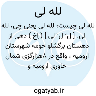 لله لی. [ ل َ ل َ لی ] ( اِخ ) دهی از دهستان برگشلو حومه شهرستان ارومیه، واقع در 8هزارگزی شمال خاوری ارومیه و 2500گزی شمال شوسه گلمانخانه ارومیه. جلگه، معتدل و مالاریائی و دارای 440 تن سکنه. آب آن از شهرچای. محصول آنجا غلات، حبوبات، توتون، انگور و چغندر. شغل اهالی زراعت و صنایع دستی جوراب بافی و راه آن ارابه رو است و تابستان اتومبیل توان برد. ( از فرهنگ جغرافیایی ایران ج 4 ).
