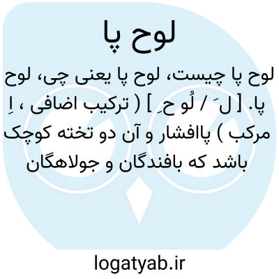 لوح پا. [ ل َ / لُو ح ِ ] ( ترکیب اضافی، اِ مرکب ) پاافشار و آن دو تخته کوچک باشد که بافندگان و جولاهگان چون پای راست بر یکی افشارند نیمی از رشته ها پایین رود و چون پای چپ را بر دیگری افشارند نیم دیگر. ( برهان ):