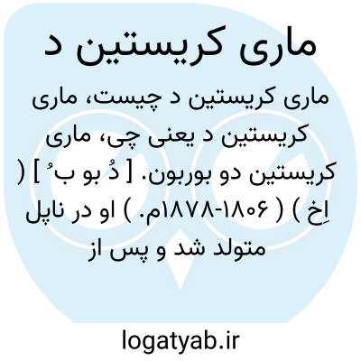 ماری کریستین دو بوربون. [ دُ بو ب ُ ] ( اِخ ) ( 1806-1878م. ) او در ناپل متولد شد و پس از ازدواج با «فردیناند هفتم » ملکه اسپانی گردید و از سال 1833 تا 1843 نایب السلطنه اسپانی بود. ( از لاروس ).
