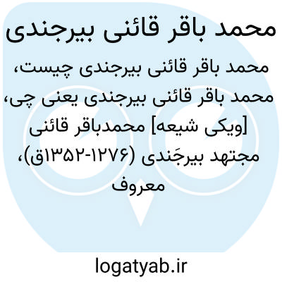 [ویکی شیعه] محمدباقر قائنی مجتهد بیرجَندی (۱۲۷۶-۱۳۵۲ق)، معروف به محمدباقر آیتی و محدث بیرجندی، فقیه، رجالی و متکلم شیعه در قرن ۱۴ قمری. بیرجندی مدتی در زادگاهش به امامت جمعه و جماعت می پرداخت و منصب قضاوت را نیز بر عهده داشت. نزدیک به ۷۰ اثر به او نسبت داده اند که کبریت احمر از مشهورترین آن هاست.