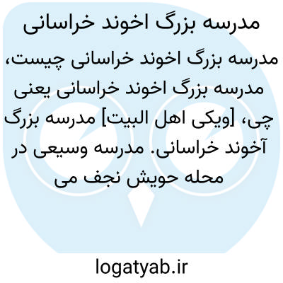 [ویکی اهل البیت] مدرسه بزرگ آخوند خراسانى. مدرسه وسیعی در محله حویش نجف می باشد که بیش از 700 مترمربع مساحت دارد و از 48 حجره تشکیل می شود.