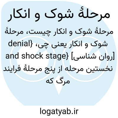 {denial and shock stage} [روان شناسی] نخستین مرحله از پنج مرحلۀ فرایند مرگ که دورۀ زودگذر و حادی است و در آن فرد با شناسایی و پذیرش اینکه به یک بیماری کشنده مبتلاست، دچار اضطراب شدیدی می شود
