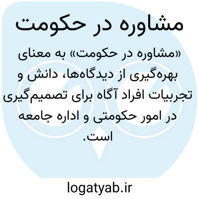 «مشاوره در حکومت» به معنای بهره‌گیری از دیدگاه‌ها، دانش و تجربیات افراد آگاه برای تصمیم‌گیری در امور حکومتی و اداره جامعه است. این اصطلاح بر اهمیت مشارکت فکری و خرد جمعی در ساختارهای سیاسی تأکید دارد و نشان می‌دهد که تصمیم‌های حکومتی نباید بر پایه خواست فردی یا نظر شخص واحد باشد. مشاوره در حکومت از اصول مهم مدیریت عادلانه و کارآمد است و در بسیاری از نظام‌های سیاسی، شوراها، هیئت‌ها و مجامع مشورتی برای این منظور تشکیل می‌شود. در منابع اسلامی نیز «شورا» جایگاه ویژه‌ای دارد و به حاکمان توصیه می‌شود با افراد دانا، باتجربه و خیرخواه در امور مهم مشورت کنند. این فرایند سبب می‌شود تصمیم‌ها منطقی‌تر، کم‌خطاتر و هماهنگ‌تر با نیازهای جامعه باشند. مشاوره همچنین باعث افزایش اعتماد عمومی و مشارکت مردم در اداره کشور می‌شود، زیرا شهروندان احساس می‌کنند نظر و تجربه آنان در سیاست‌گذاری‌ها اثرگذار است. این مفهوم در تاریخ، فلسفه سیاسی و علوم اجتماعی به‌عنوان یکی از پایه‌های حکمرانی خوب شناخته شده است. مشاوره در حکومت می‌تواند در حوزه‌های مختلف مانند اقتصاد، فرهنگ، امنیت، آموزش و روابط بین‌الملل صورت گیرد و هر زمینه نیازمند متخصصان و کارشناسان مربوط به خود است. بر اساس این اصل، حاکم یا دولت باید فضایی فراهم کند که نظرات آزادانه بیان شود و نتیجه مشورت در تصمیم‌گیری لحاظ گردد.