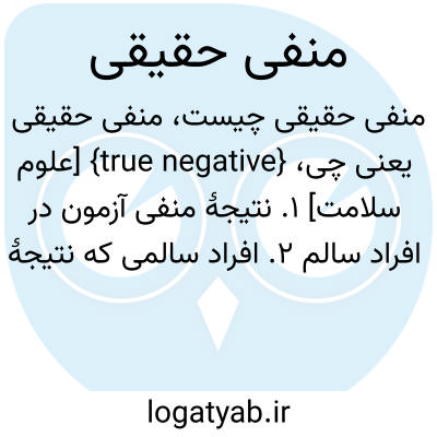 {true negative} [علوم سلامت] 1. نتیجۀ منفی آزمون در افراد سالم 2. افراد سالمی که نتیجۀ آزمون منفی داشته اند