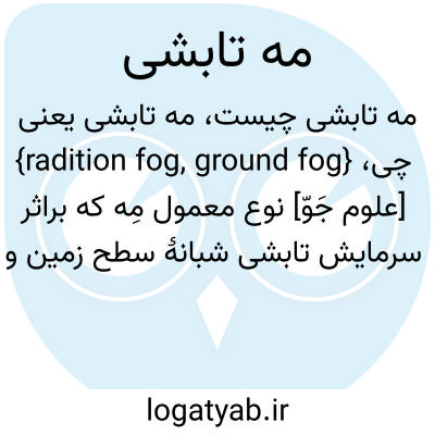 {radition fog, ground fog} [علوم جَوّ] نوع معمول مِه که براثر سرمایش تابشی شبانۀ سطح زمین و کاهش دمای هوا تا نقطۀ شبنم یا پایین تر از آن تشکیل می شود